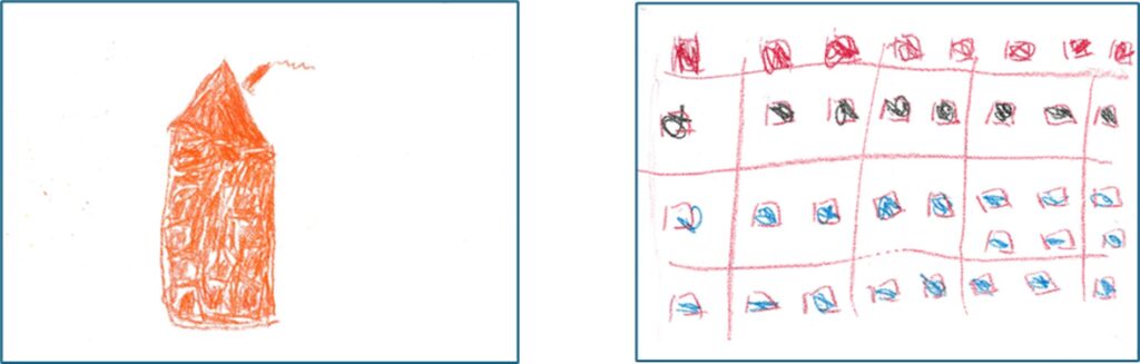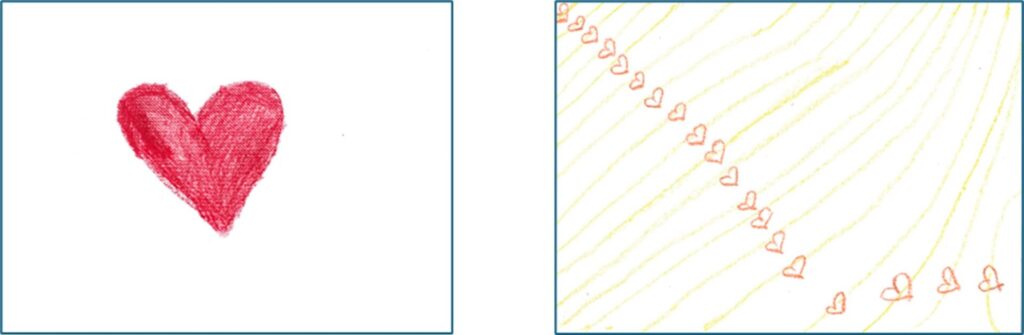 Tekeningen zijn individuele voorstellingen die altijd ook iets zeggen over de tekenaar zelf. Dat wordt duidelijk als je de tekeningen van een persoon naast elkaar legt, waarbij de ene tekening zijn eigen handelingsimpuls weergeeft en de andere handelingsimpuls van iemand anders. Hier twee voorbeelden: