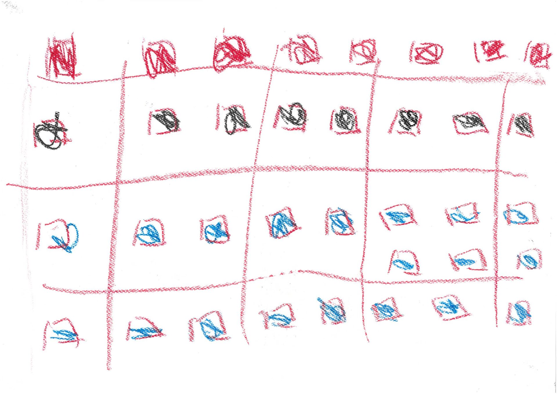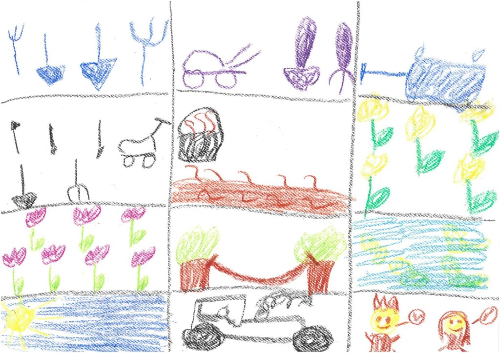 In einer Gruppe von sechs Personen sitzen wir zusammen, um die Handlungsimpulse zu zeichnen. Wir wählen immer einen Handlungsimpuls aus und fertigen dann unsere persönlichen Zeichnungen zu diesem Handlungsimpuls an. Als erstes ist Nadja an der Reihe. Ihr Handlungsimpuls ist ‚ordnend Zielen‘. Sie zeichnet ihren eigenen Handlungsimpuls. Ohne lange zu überlegen, zeichnet sie ein Raster mit 3×4 Kästchen. Jedem Kästchen ordnet sie ein Thema zu: im einen die Gartengeräte, im anderen die Blumen, im dritten die Regenwürmer und so weiter. Als ich das Motiv ihres Bildes sehe, und beobachte mit welcher Klarheit und Zielgerichtetheit sie ihr Bild malt, bekomme ich ein vertiefendes Verständnis darüber, was ‚ordnend Zielen‘ bedeutet, wie es sich anfühlt, wie es sich manifestiert.